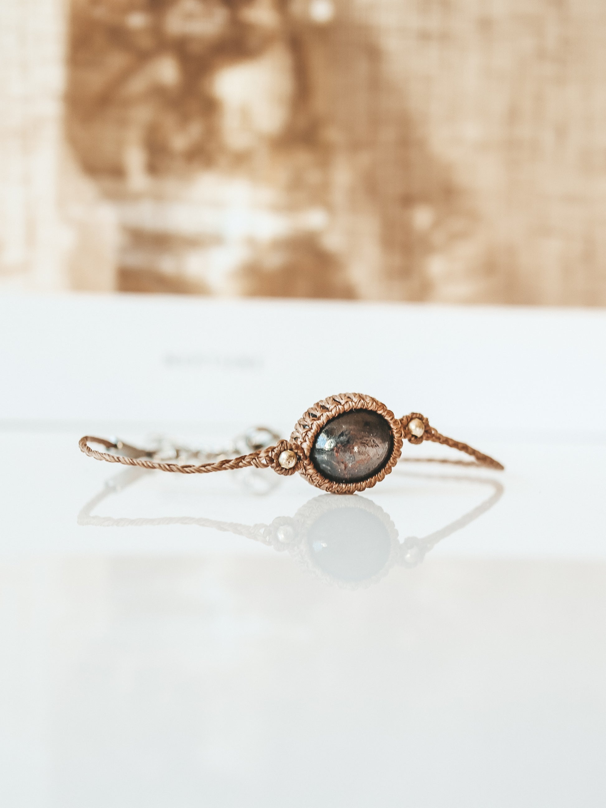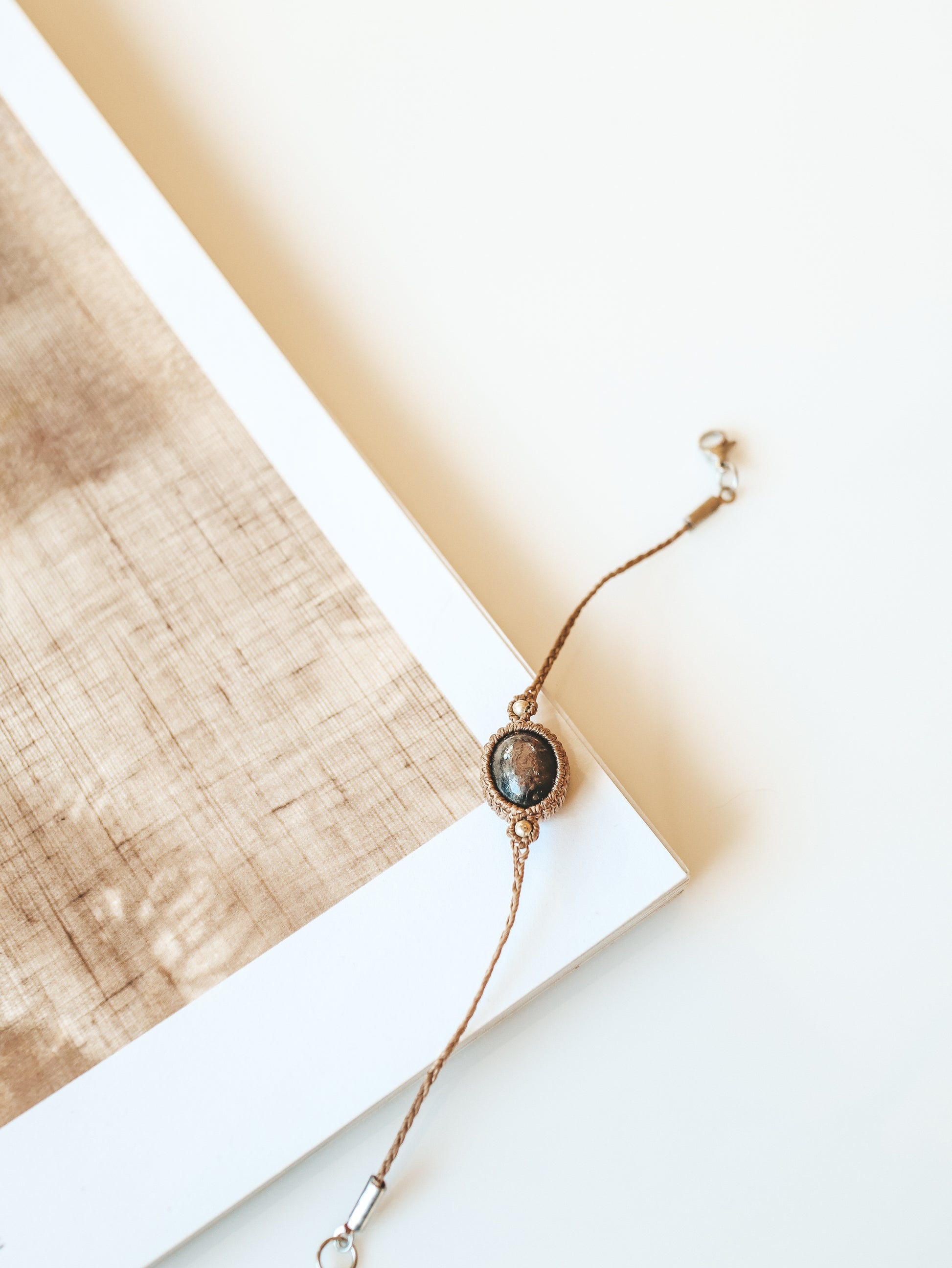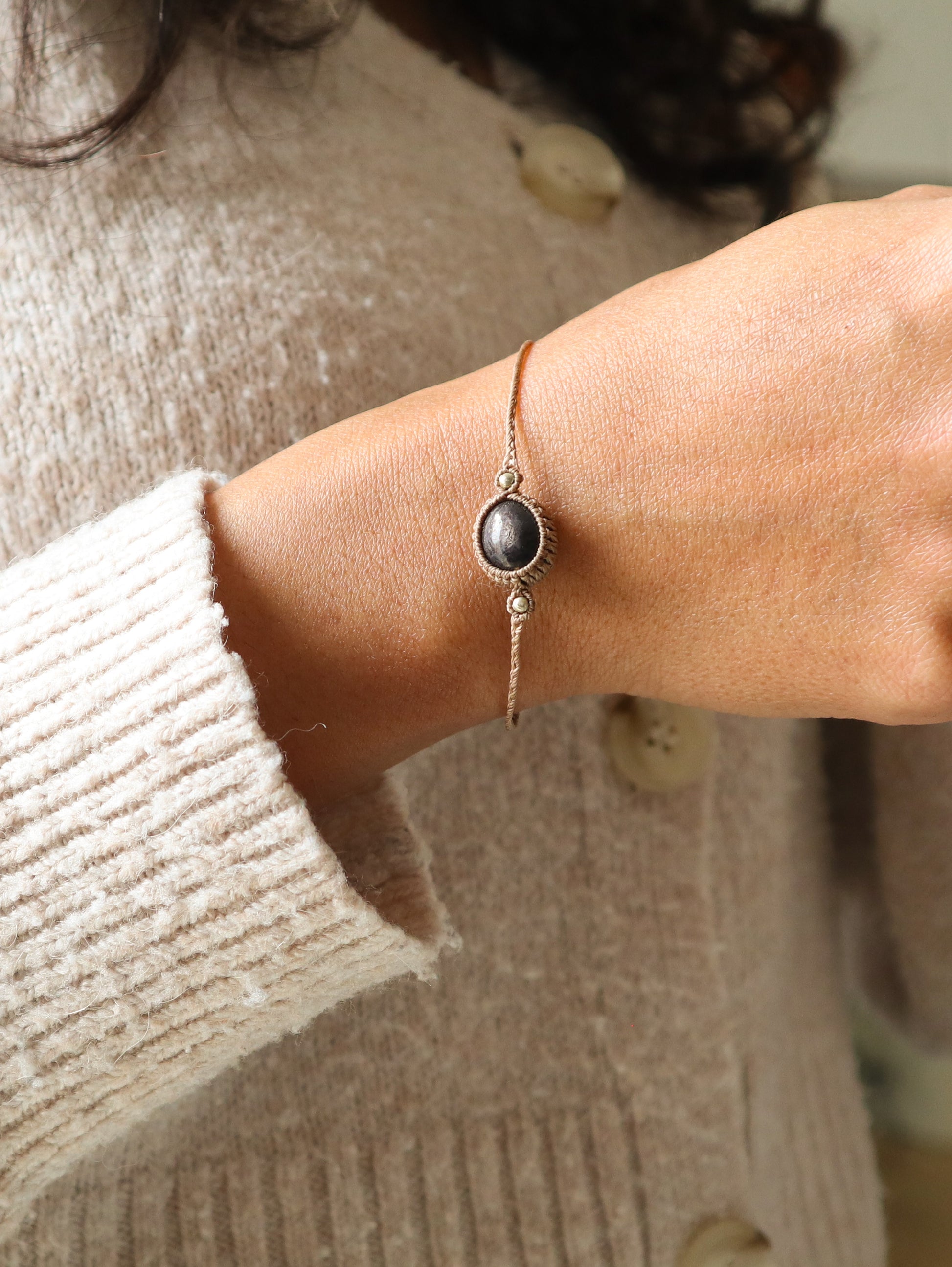Crafted with precision, this macrame bracelet features genuine black sapphire stone woven into hand-knotted cord work. The deep, lustrous stones are believed to enhance mental clarity and inner peace, making this piece both a striking accessory and a meaningful companion. The adjustable design ensures a comfortable fit for most wrists, while the natural fiber construction offers durability without compromising elegance. Perfect for layering or wearing solo, this bracelet bridges bohemian style with timeless sophistication.