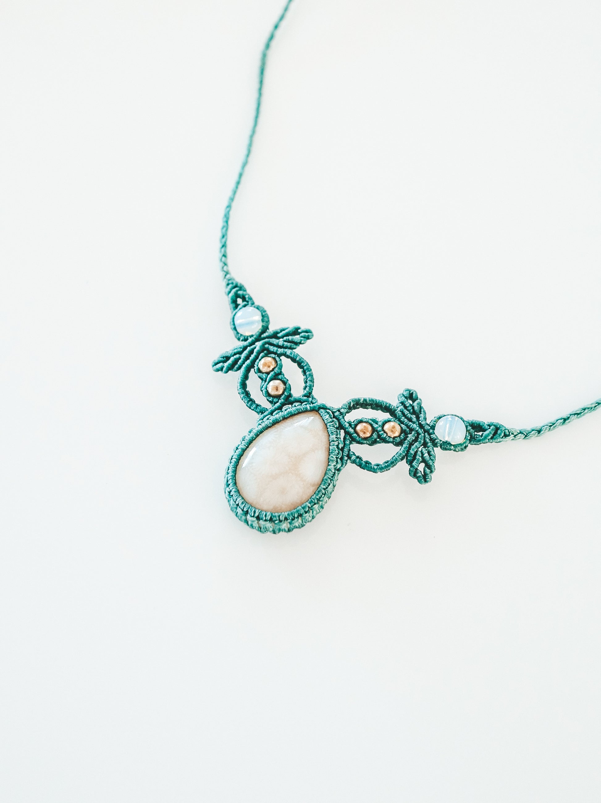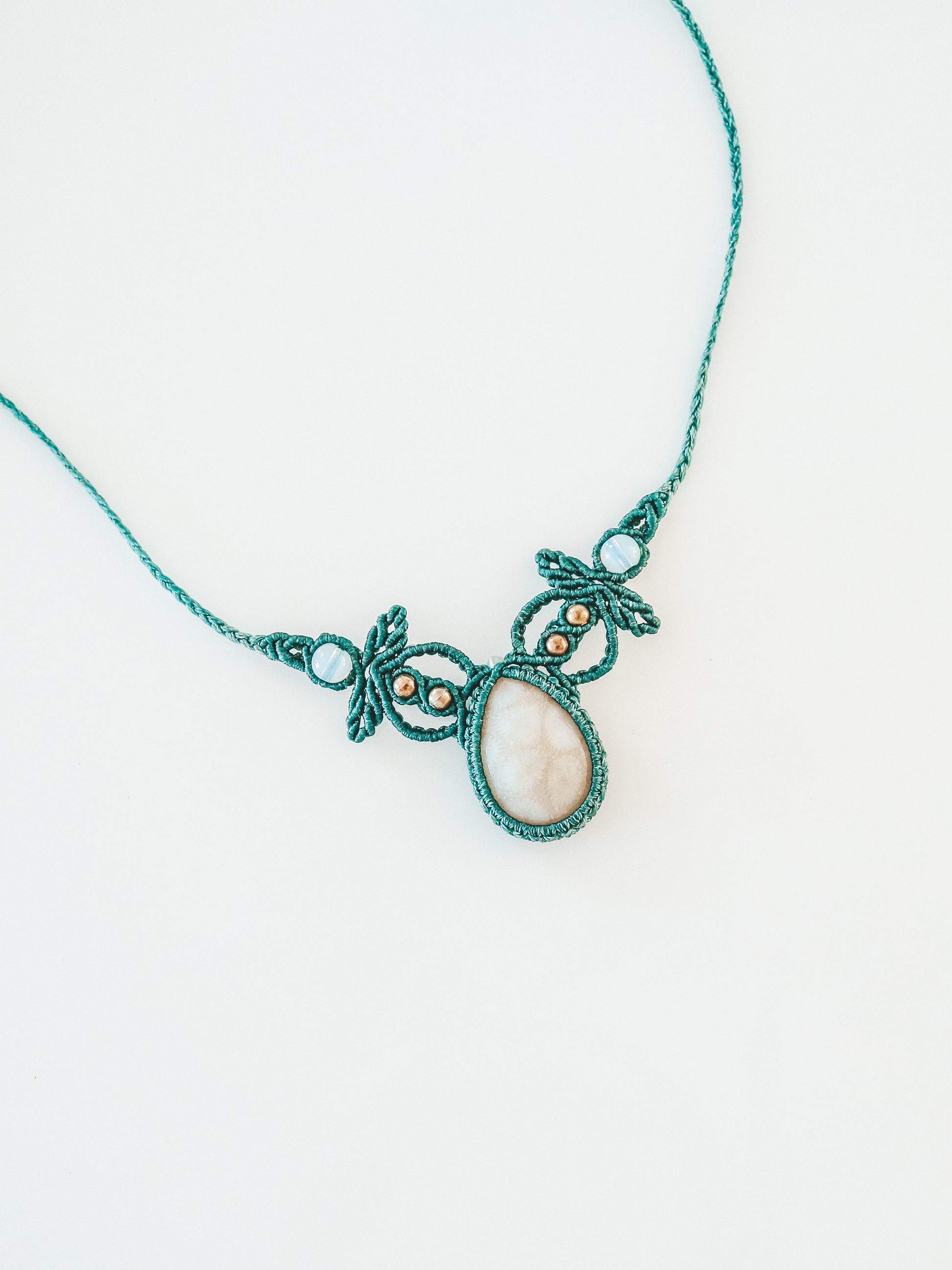 The Fossil Coral Macrame Necklace combines natural elegance with artisanal craftsmanship. Featuring genuine fossil coral, each pendant is uniquely patterned, highlighting the intricate history of ancient marine life. The handwoven macrame cord not only secures the pendant but offers adjustable comfort and durability. This necklace suits those who appreciate timeless, organic beauty paired with meticulous technique, perfect for adding a subtle statement to both casual and formal wear.