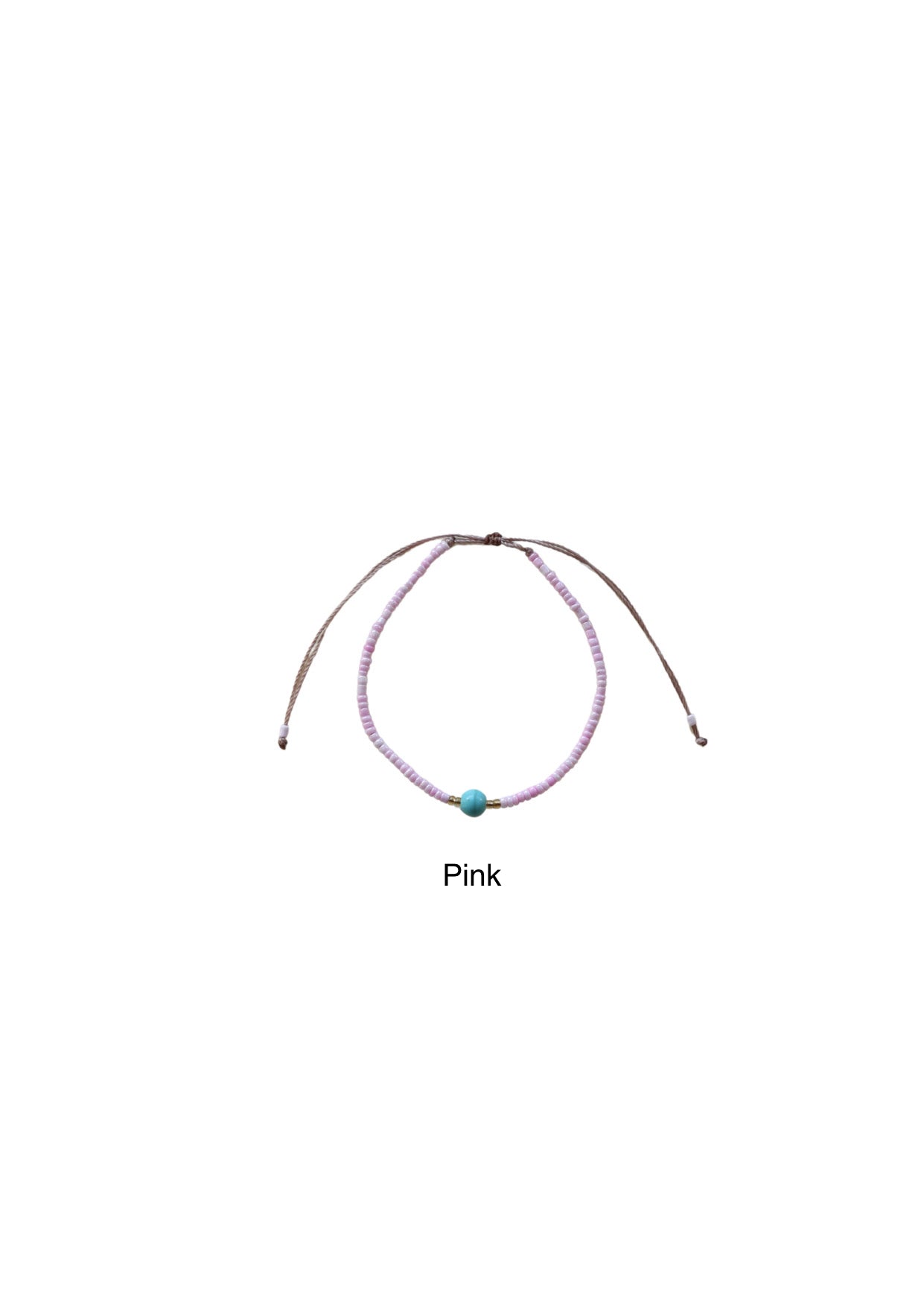 This delicate, handmade anklet features a mix of soft pink, white, and shimmering seed beads with turquoise accents — inspired by the calm waters and pastel sunsets of Sindhu Beach.