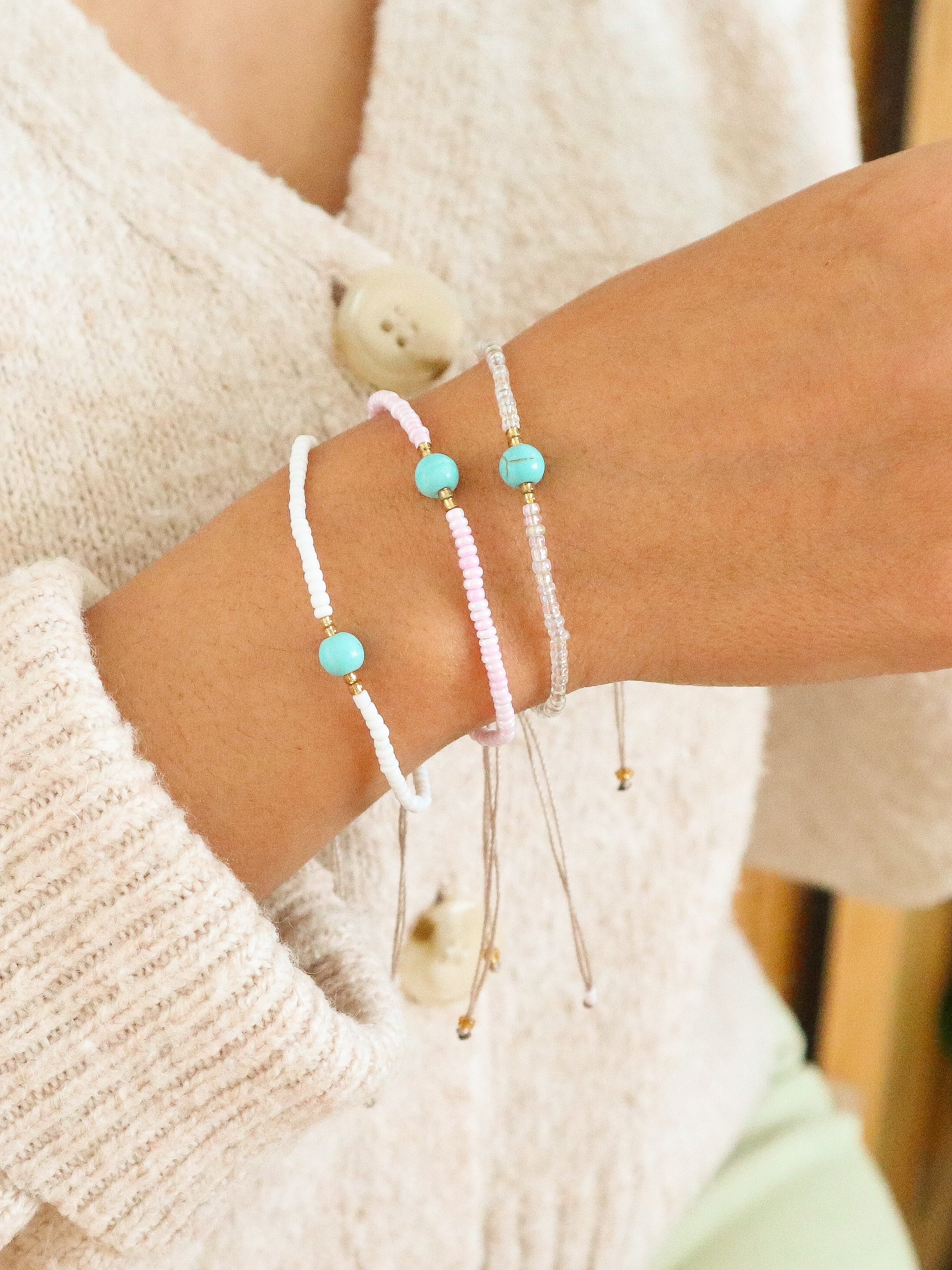 This delicate bracelet combines pink and white glass seed beads with turquoise accents for a subtle pop of color. Lightweight and adjustable, it’s perfect for layering, gifting, or wearing every day as a reminder of sunshine and sea breeze.